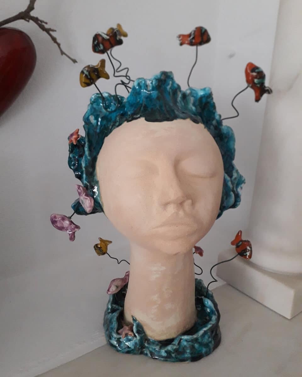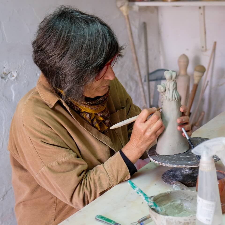 Cristina Claro descobriu “por acaso” a sua paixão pela cerâmica e foi também por acaso que chegou a Vila Viçosa, onde tem o seu atelier aberto desde 2002. Hoje, sente-se uma filha da terra, com formação em pintura e decoração de cerâmica, azulejaria, vidrados, escultura, mural cerâmico, e em constante aprendizagem.